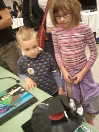 My kids had a great time at the faire, too. Here they are watching (and hearing) a record player, for the very first time in their lives: